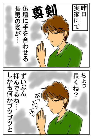 長時間仏壇に向かう息子に